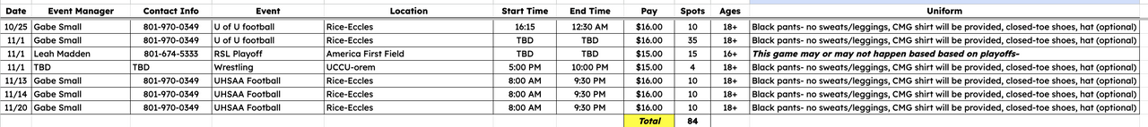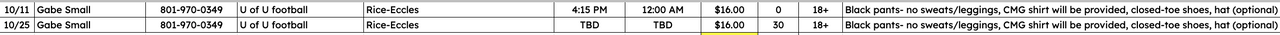 Note: Football games require the CMG Orange Security Polo or Jacket. Those will be issued to workers on site. The Salt Place events require a white long sleeve button down shirt. A security vest will be issued on site. Closed Toe shoes at all events. Black pants for all indoor events. Football games allow black shorts, no holes, bleach spots, no leggings, no basketball style shorts.