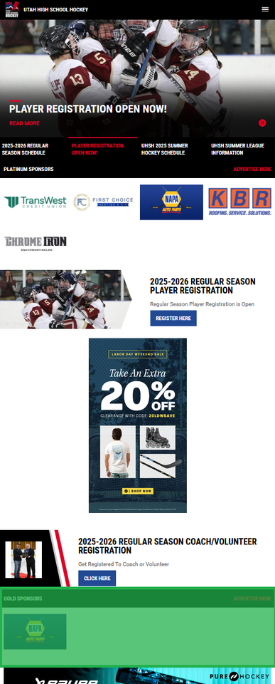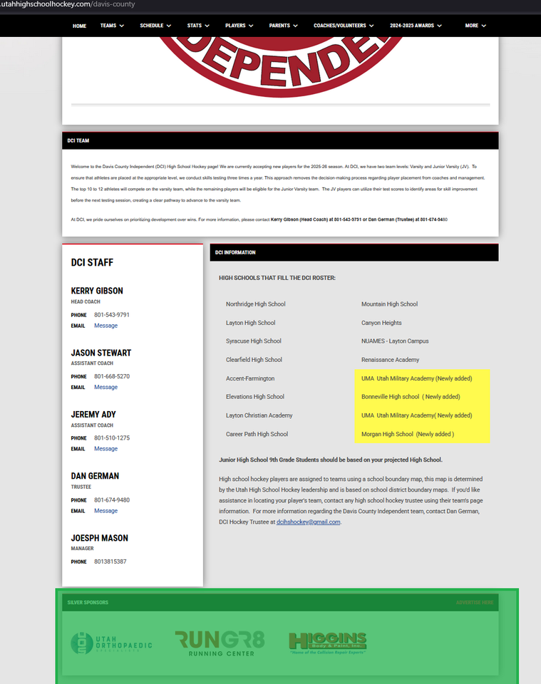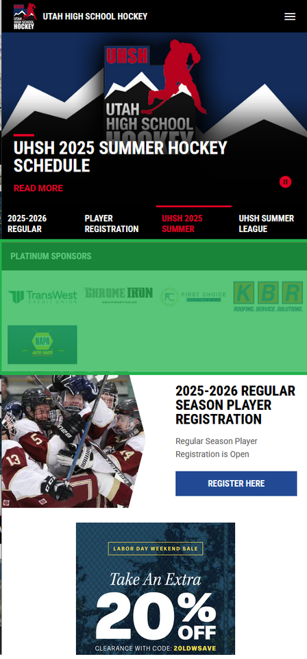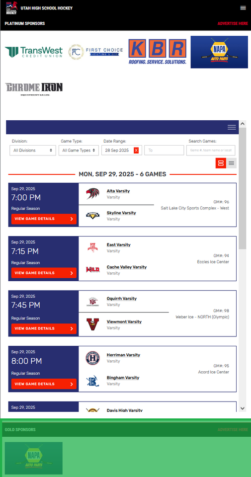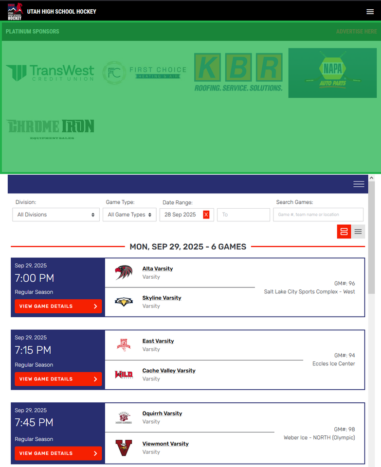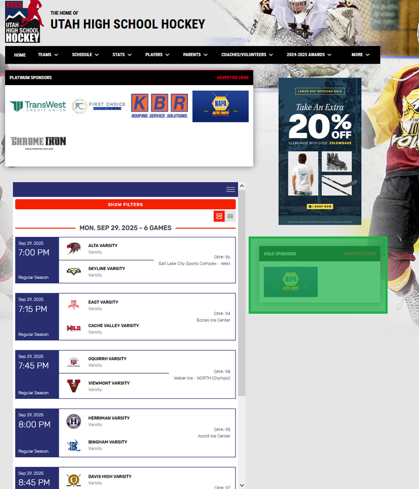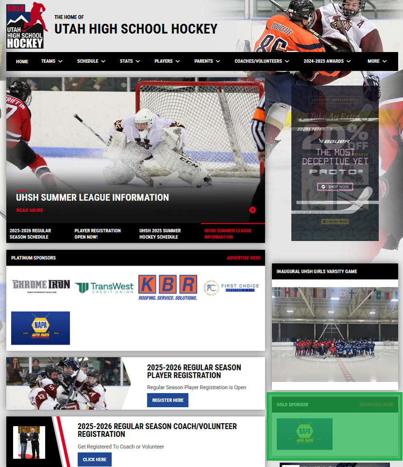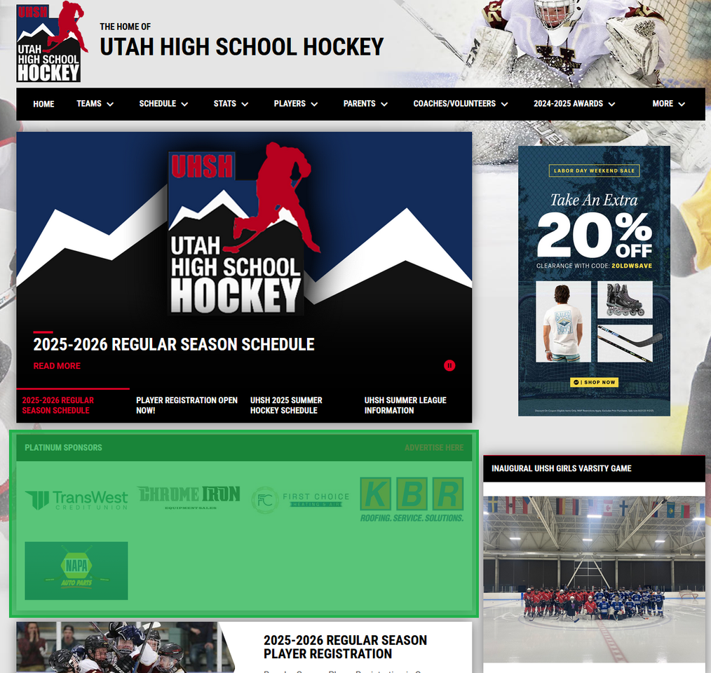Own the spotlight. Your logo takes the top of our Home, Stats, and Schedule pages where every visit begins and the most engaged fans linger. Rotating placement includes a logo and link to your website or social. $500.